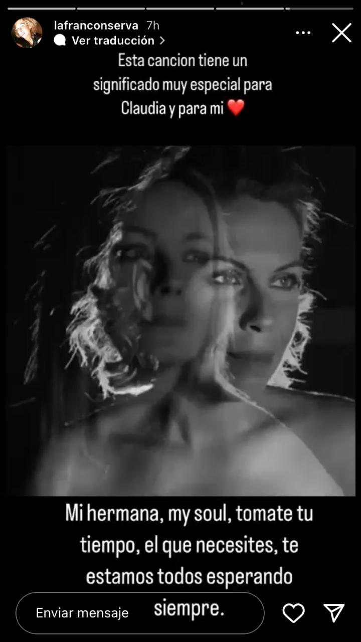 "Mucho amor, fuerza y luz a todas las mujeres con #Cancerdemamas" comenzó escribiendo Fran Conserva. "Esta canción tiene un significado muy especial para Claudia y para mí. Mi hermana, mi soul, tómate tu tiempo, el que necesites. Te estamos todos esperando, siempre", añadió luego en su publicación.