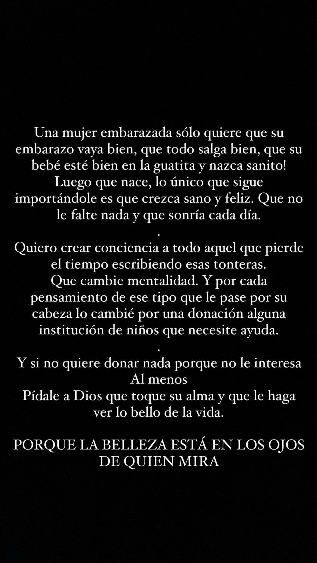 “Y si no quiere donar nada porque no le interesa, al menos pídale a Dios que toque su alma y que le haga ver lo bello de la vida. Porque la belleza está en los ojos de quien mira”, concluyó.