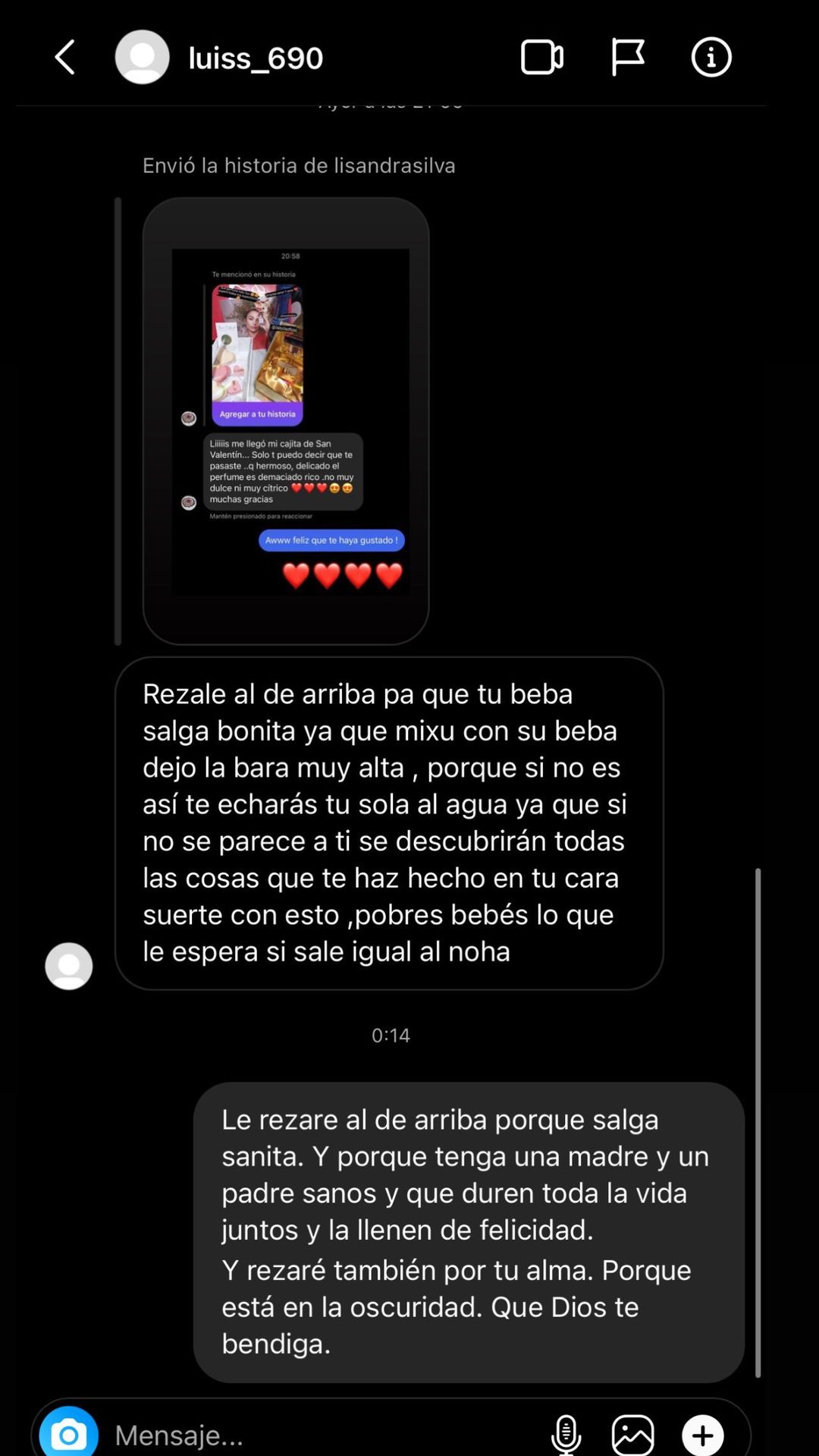 Ante esto, Lisandra no se quedó callada y respondió ante el desubicado comentario: “le rezaré al de arriba porque salga sanita y porque tenga una madre y un padre sanos que duren toda la vida y la llenen de felicidad. Y rezaré también por tu alma, porque está en la oscuridad. Que Dios te bendiga”.