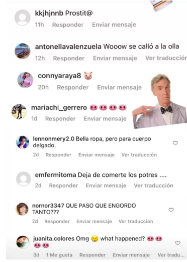 “Se cayó a la olla”, “deja de comerte los postres” o “bella ropa, pero para cuerpo delgado”, son algunos de los desagradables mensajes que ha recibido por su cuerpo. Entre ellos, también algunas personas le envían emojis de cerdo.