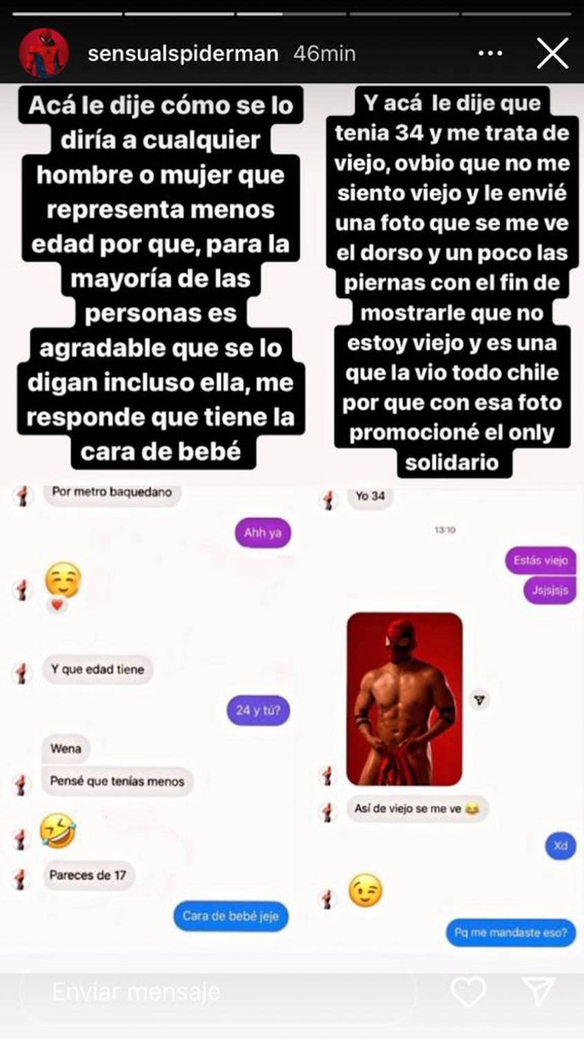 A partir de esto, el modelo aclara un punto sobre el que se hizo especial énfasis. En la funa, la mujer destaca la forma en la que él la cree menor de edad, reconociéndolo como un indicio alarmante. “le diría a cualquier hombre o mujer que representa menos edad porque, para la mayoría de las personas es agradable que se le digan incluso ella, me responde que tiene la cara de bebé”,fue lo que dijo en su defensa “Spiderman”.