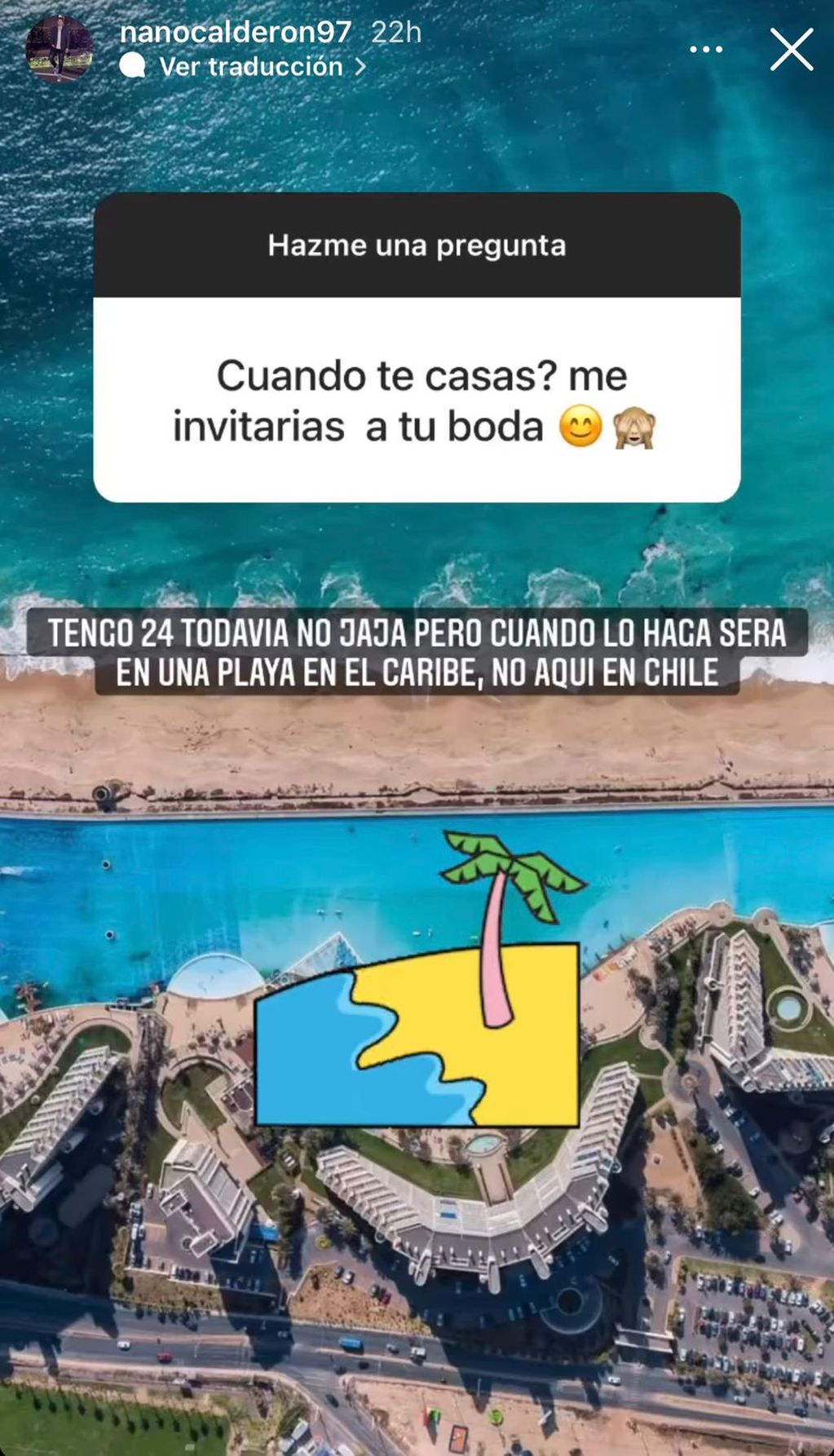 “¿Cuándo te casas? Me invitarías a tu boda?” fue lo que le consultaron al joven. Ante esto, Nano entregó una respuesta que sorprendió a sus fans: “Tengo 24, todavía no jaja.“Cuando lo haga será en una playa en el caribe, no aquí en Chile”.