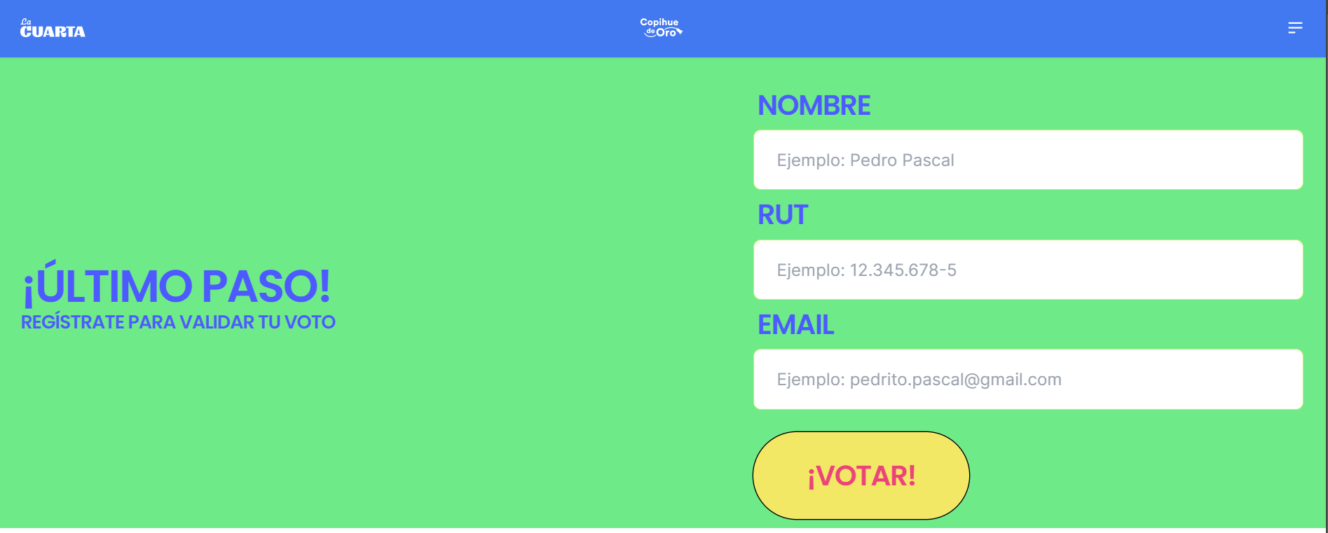 Al terminar de escoger a tus nominados, solo tendrás que rellenar el formulario que aparece con tus datos personales, como: tu nombre completo, tu rut y correo.