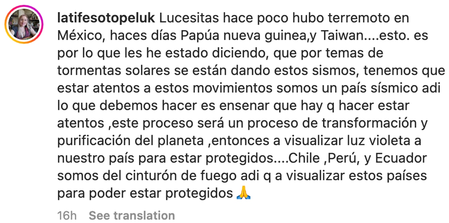 Luego agregó que “lo que debemos hacer es enseñar qué hay que hacer, estar atentos, este proceso de transformación y purificación del planeta, entonces visualizar luz violeta a nuestro país para estar protegidos… Chile, Perú y Ecuador somos del cinturón de fuego así que a visualizar estos países para poder estar protegidos”.