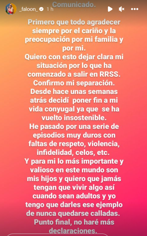 Hace solo unos días, comenzó a rumorearse que Faloon Larraguibel se había separado de su esposo, Jean Paul Pineda, luego de que lanzara un fuerte mensaje en contra de los hombres a través de sus redes sociales. Ahora ha confirmado la información.