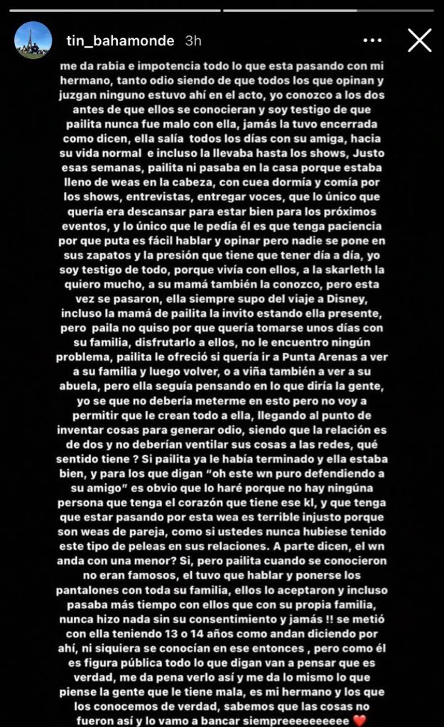 Allí, la joven abordó temas de su relación con la mamá del cantante, una supuesta despreocupación por la relación, manipulación por el artista, entre otros temas. Sin embargo, la controversia nuevamente encendió internet, luego de que Martín (@tin_bahamonde), bailarín y supuesto amigo de ambos, publicara por medio de sus stories su versión de los hechos y defendiera al cantante.