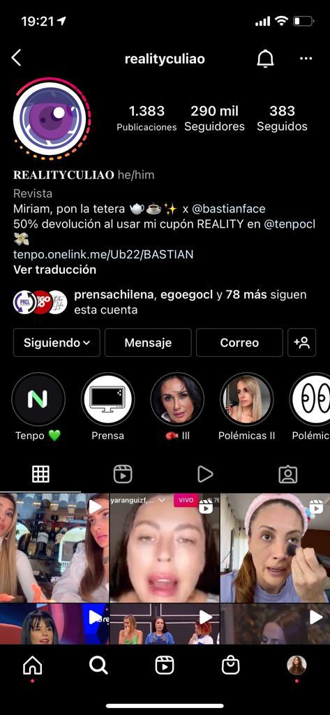 A diferencia del “medio" anteriormente mencionado, @realityculiao se dedica a publicar contenido de personajes “clásicos” del espectáculo chileno: “Porque desde ahí nace mi cuenta, de subir cortos de realitys, si bien, he ido mutando el contenido en el último tiempo e intento subir un poco de actualidad, pero podría definirla como una cuenta de retro farándula”.