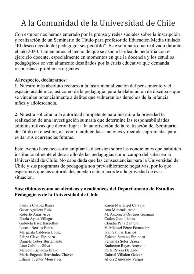 Ante los múltiples cuestionamientos, la Facultad de Filosofía y Humanidades de la Universidad de Chile tuvo que salir a referirse al trabajo titulado “Pedófilos e infantes: pliegues y repliegues del deseo”, proyecto que incluida varias frases en referencia a niños, niñas y adolescentes.