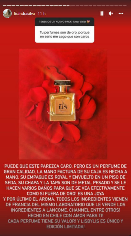 ¿AROMA EXCLUSIVO? Todos los ingredientes vienen de Francia, del mismo laboratorio que le vende los ingredientes a Lancôme, Chanel, entre otros. Hecho en Chile con amor para ti. Cada perfume tiene su valor y ‘Lisbylis’ es único y de edición limitada”.
