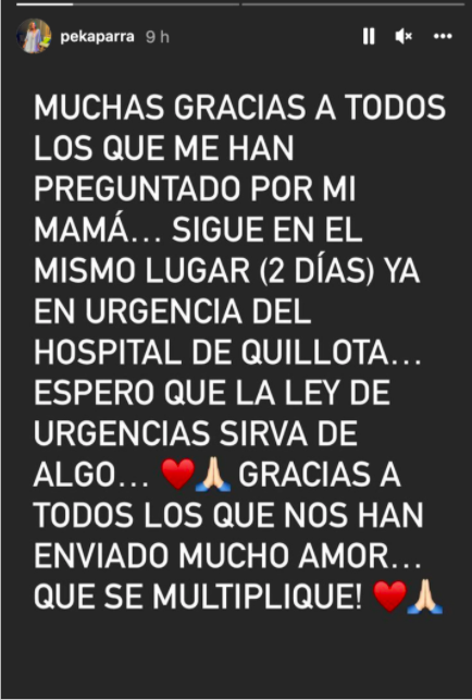 La figura televisiva afirmó al medio BioBioChile que su madre fue diagnosticada con un derrame en el pericardio y un trombo en una pierna. Haciendo énfasis, en que su padre recalcó que su progenitora pasó múltiples horas en un sillón del lugar “porque no hay camas”.