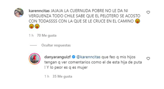 Una seguidora de la modelo comentó en la publicación: “La cornuda, pobre no le da ni vergüenza. Todo Chile sabe que el pelotero se acostó con todas con las que se le cruce en el camino”. Sin embargo, Aránguiz reaccionó ante el comentario: “Que feo que mis hijos tengan que ver comentarios como el de esta hija de pu…! Y lo peor es que es mujer”.