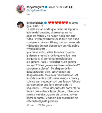 Asimismo, el deportista alzó la voz y escribió una particular reflexión en el post: “Te amo igual amor… la vida es tan corta que mientras algunos hablan del pasado, el presente se les pasa enfrente y no hacen nada con sus vidas. Viven pendientes de la foto que suba cualquiera para en 10 segundos comentar y después de eso siguen con su vida pobre y vacía de alma. Quiéranse más, sobre todo las mujeres que vienen a recordar lo que ya fue. Me pregunto si el comentario maldadoso les genera plata? Felicidad? Les genera trabajo? Si les genera sentirse realizados?? Les genera placer? Se alegran de las desgracias del otro, aprovechan las desgracias del otro para recordarlas”.
