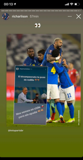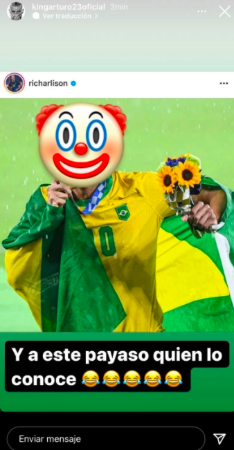 El volante de la selección chilena, Arturo Vidal, no recibió con gusto el irónico mensaje que realizó el brasileño Richarlison. Por lo cual, arremetió en su contra en sus historias de Instagram.