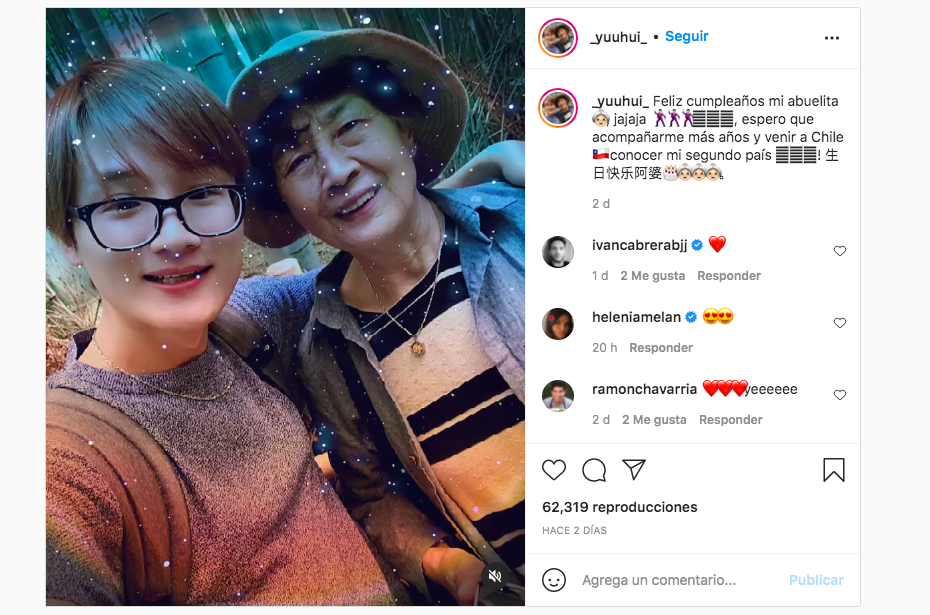 El joven oriundo de China, Yuhui Lee, publicó en redes sociales un especial saludo de cumpleaños dedicado a su abuelita. “Feliz cumpleaños mi abuelita. Espero que pueda acompañarme más años y venir a Chile a conocer mi segundo país”, fue parte de lo que escribió Lee en la postal donde se le ve junto a la persona que lo cuidó toda su vida.