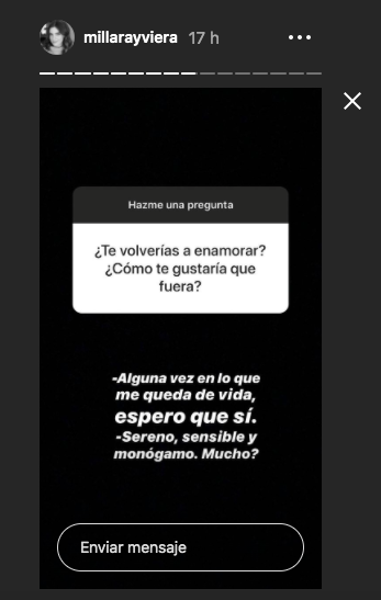 El usuario le preguntó directamente si se volvería a enamorar y cómo le gustaría que fuera su nueva relación o pareja, a lo que Millaray respondió “Alguna vez en lo que me queda de vida, espero que sí” y sobre la segunda pregunta, respondió que le gustaría que fuera “sereno, sensible y monógamo”.